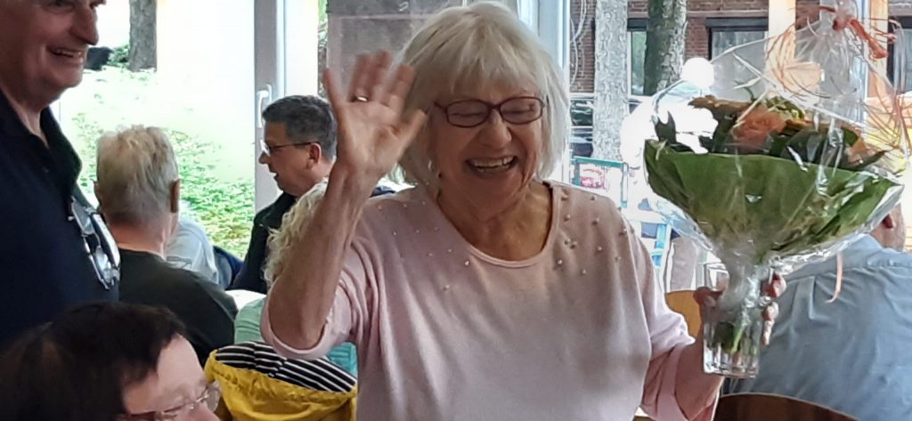 Günther kam natürlich nicht mit leeren Händen – er überreichte Erika, die na diesem Tag Geburtstag hatte, einen wunderschönen Blumenstrauß, der gleich für leuchtende Augen sorgte. Ganz Klönstuv-typisch stimmten wir dann ein fröhliches Geburtstagsständchen an, und Erika bedankte sich mit einer kleinen, launigen Rede, die viele zum Schmunzeln brachte.