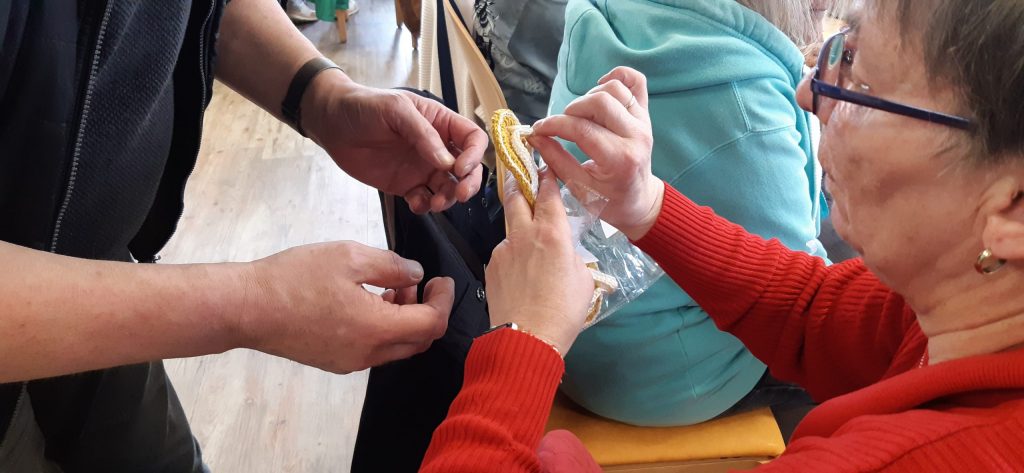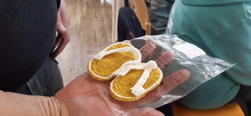 Auch kreativ ging’s zu: Manuela zeigte ihre winzigkleinen, selbstgehäkelten Flip-Flops, die auf Wunsch aus der Runde entstanden waren. Die Begeisterung war groß – solche Handarbeit sieht man nicht alle Tage!