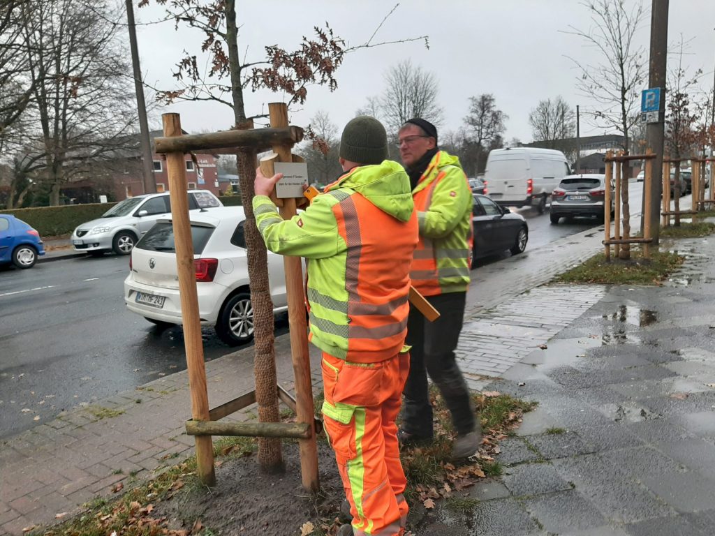 Heute war’s soweit: Für unsere fünf Baumpatenschaften – jeweils im Wert von 300 € – wurden endlich die neuen kleinen Schilder angebracht. Die netten Mitarbeiter der Firma…TBW Stadtgrün…, Herr Duden und Herr Schütte, haben die Schilder direkt an den Stützpfählen der jungen Bäume befestigt.